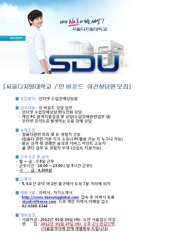 | 제목 | 서울디지털대학교 야간 인바운드 상담원 [공덕역] | ||||