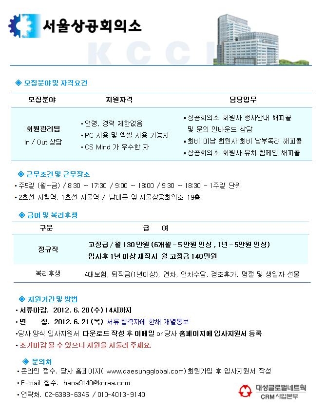 | 제목 | [시청역] 서울상공회의소 회원관리팀 상담원 모집 | ||||