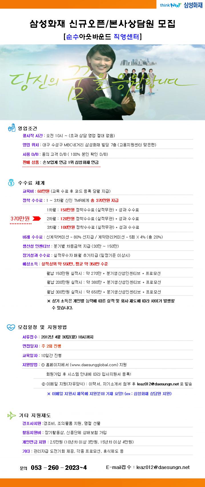 | 제목 | 삼성화재 연금저축 상담원 대모집 | ||||