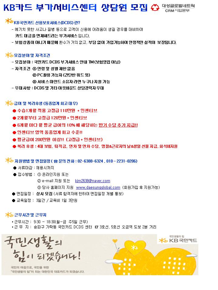 | 제목 | KB국민카드/ 부가서비스센터 상담원모집 / 오금역 | ||||