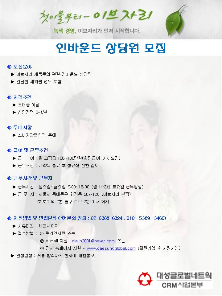 | 모집분야 | 이브자리 인바운드 | 업직종 | 고객상담 | 마감일 | 2012-05-31 |