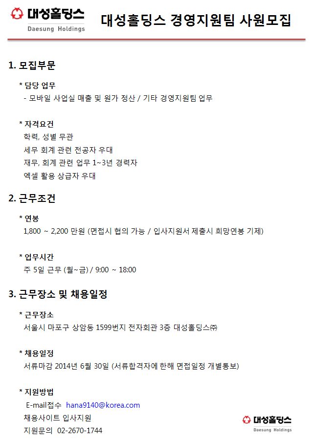 | 제목 | 대성홀딩스 경영지원팀 재무, 회계 사원모집 | ||||