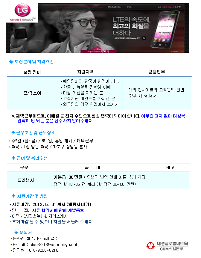 | 제목 | 프랑스어 웹사이트 고객문의 답변 / 번역/ 프리랜서 / 재택근무 | ||||