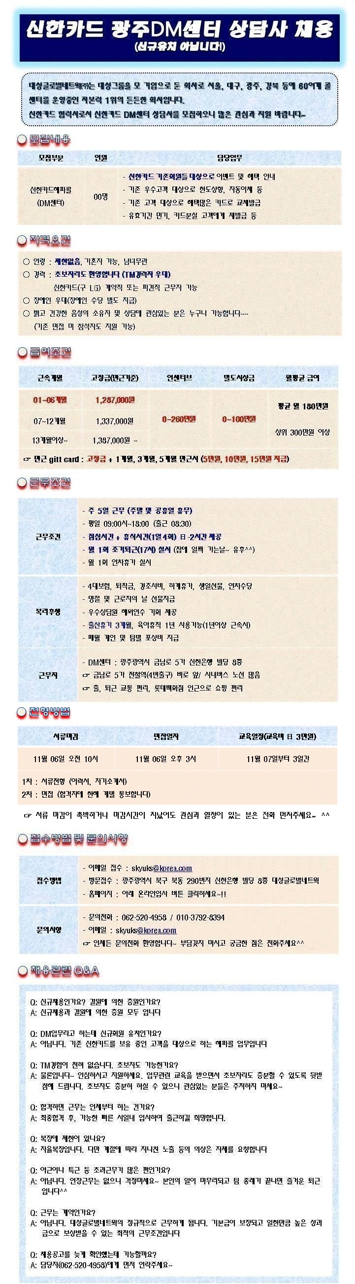 | 제목 | [주5일/급여인상]신한카드 광주DM센터 정규상담원 모집 | ||||