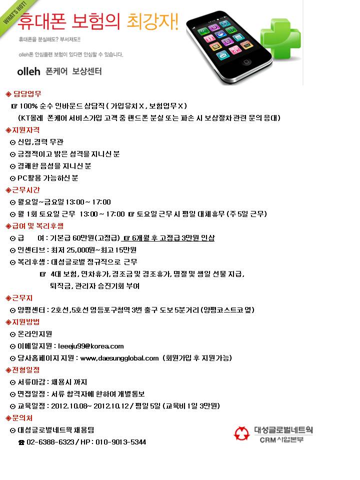 | 제목 | KT 휴대폰 안심케어 단순 분실접수 파트직 상담원 채용 | ||||