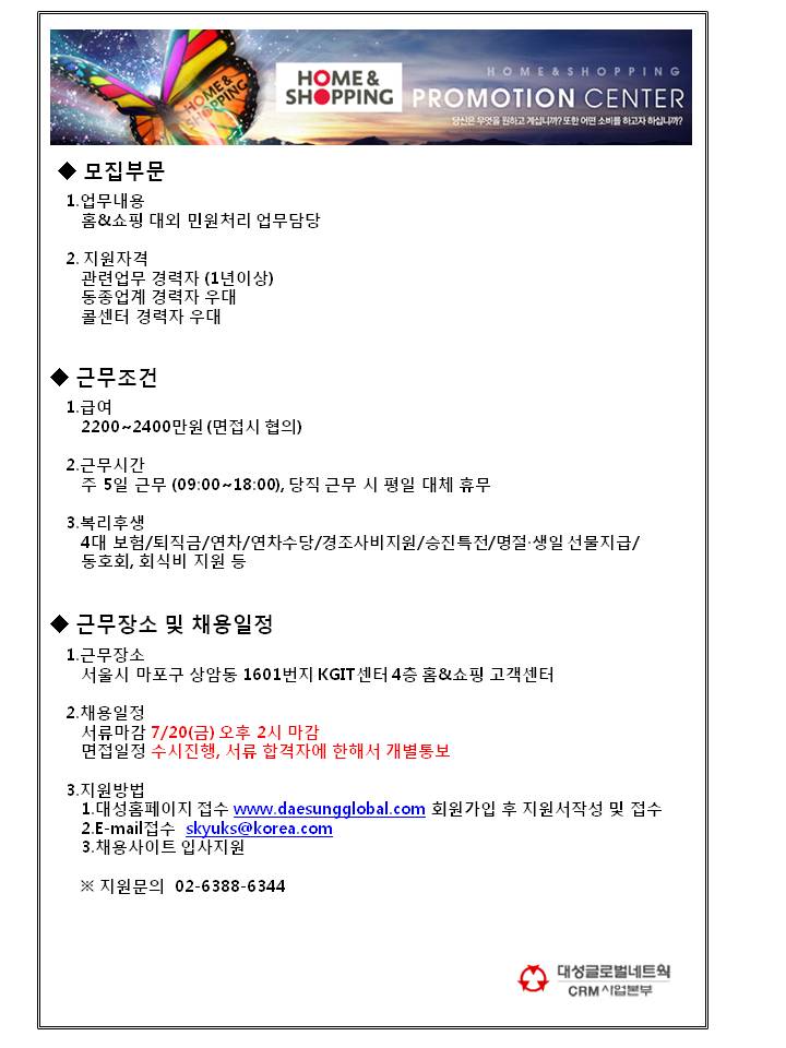 | 제목 | 홈&쇼핑 대외민원처리 관리자 채용 (상암) | ||||