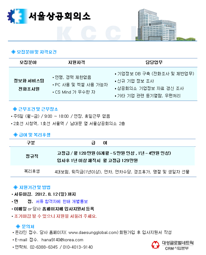 | 제목 | [시청역] 서울상공회의소 기업대상 전화조사원 모집 / 주5일 / 정규직 | ||||