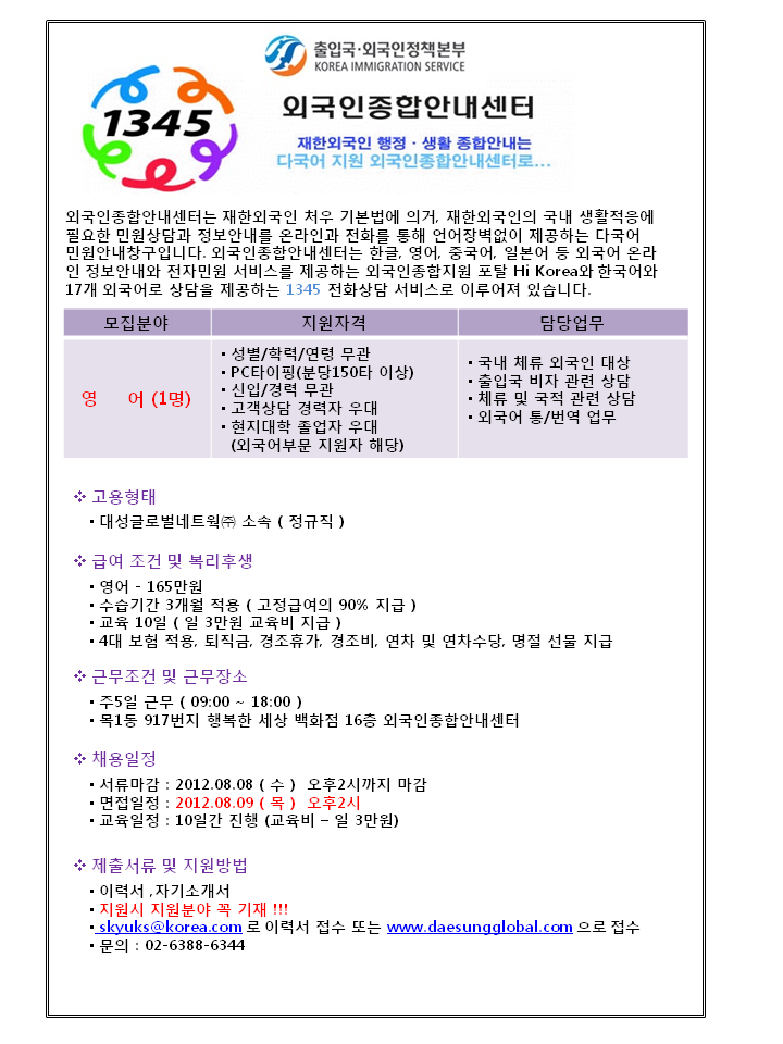 | 제목 | [목동] (영어)출입국관리사무소 인바운드 상담원 채용 | ||||