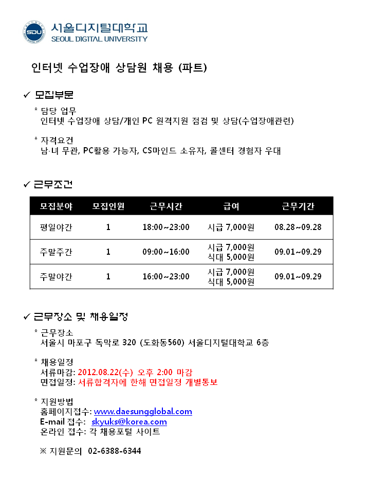 | 제목 | 서울디지털대학교 인터넷수업장애센터 상담원 모집 | ||||
