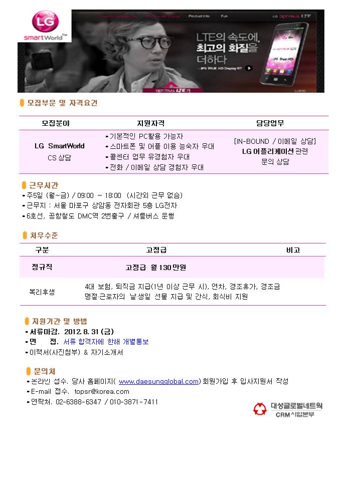 | 제목 | [DMC역] LG SmartWorld 인바운드 고객상담원 모집 | ||||