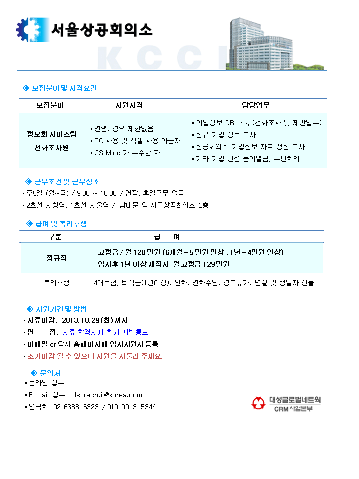 | 제목 | [시청역] 서울상공회의소 기업대상 전화조사원 모집 / 주5일 / 정규직 | ||||