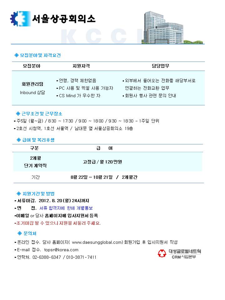 | 제목 | [서울역/단기계약직] 서울상공회의소 회원관리팀 인바운드 상담 | ||||