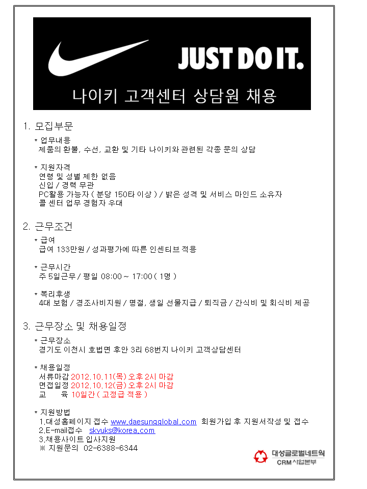| 모집분야 | 나이키 | 업직종 | 고객상담 | 마감일 | 2012-10-11 |