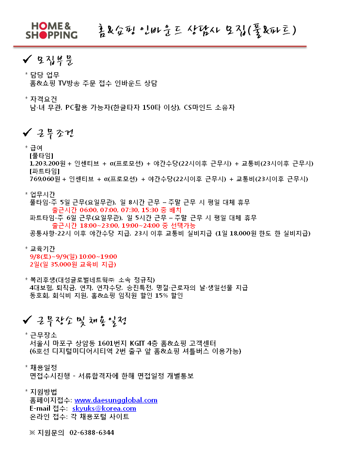 | 제목 | 홈&쇼핑 고객상담원 모집 (풀&파트) | ||||