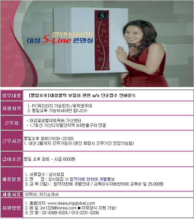 | 제목 | [평일오후]대성셀틱 A/S접수 인바운드 상담원 모집 | ||||