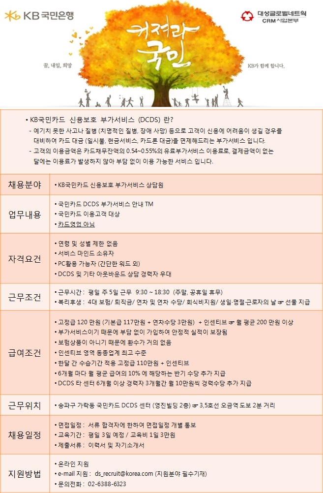 | 제목 | KB국민카드 신용보호 부가서비스 상담원 모집 | ||||