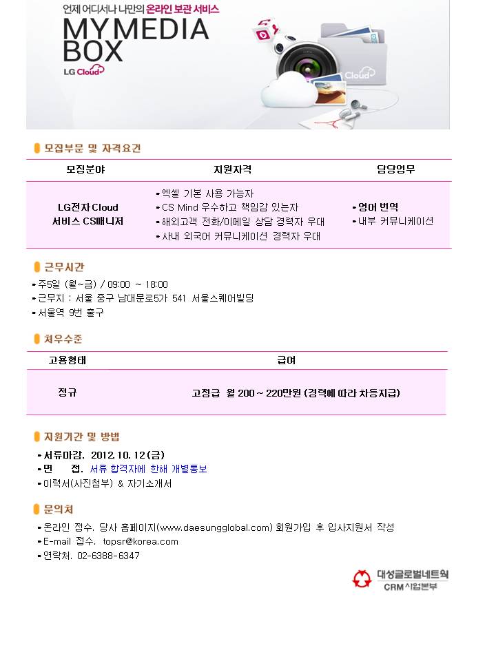 | 제목 | [서울역/주5일] LG클라우드 서비스 CS매니저 모집 | ||||
