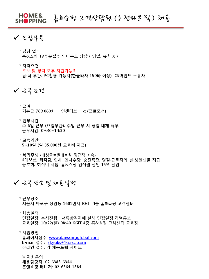 | 제목 | 홈&쇼핑 주문접수 고객상담원 채용 (오전파트직) | ||||