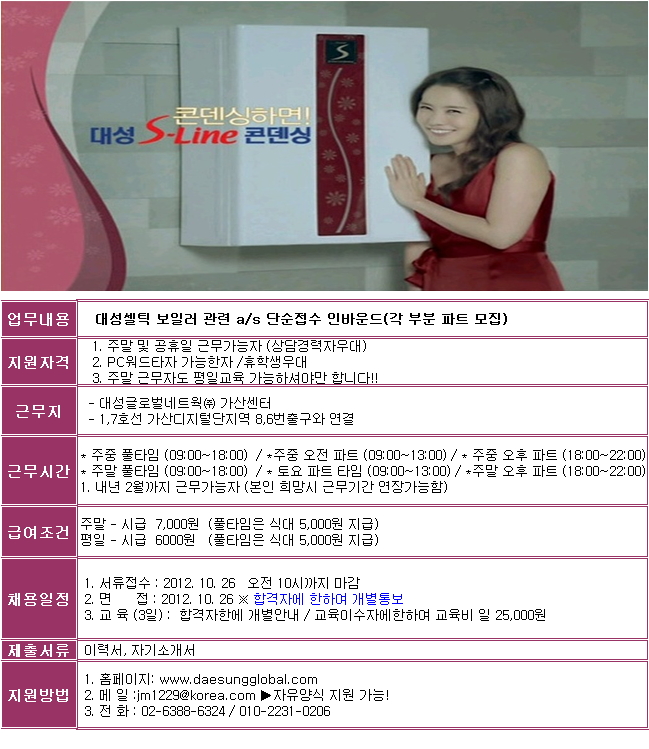 | 제목 | [가산]대성셀틱 보일러 A/S접수 인바운드 상담원 모집 | ||||