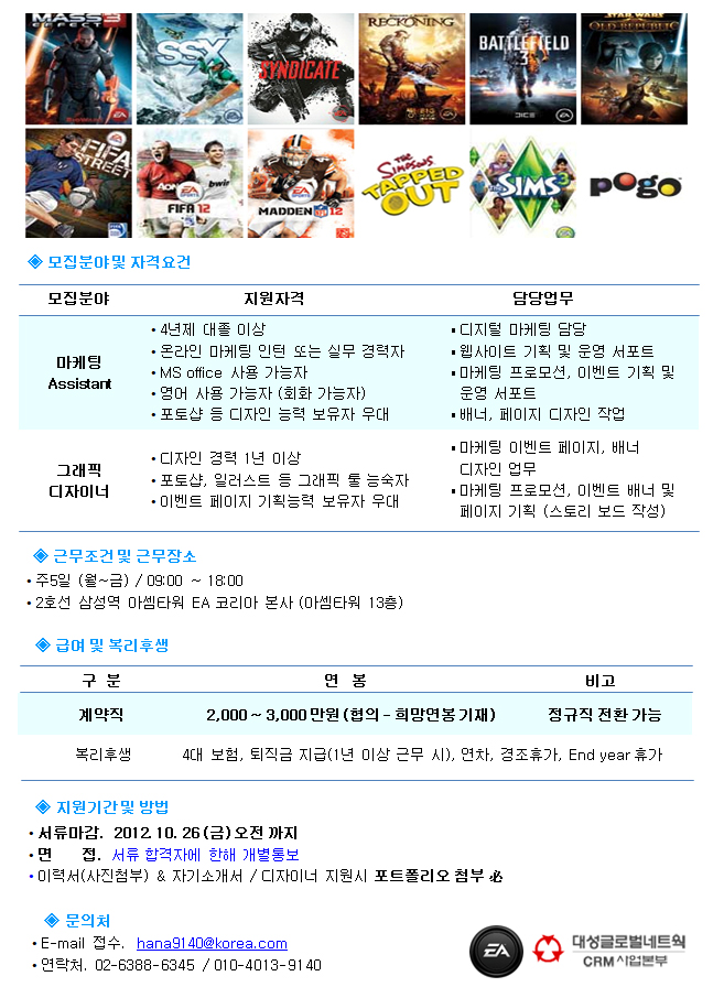 | 제목 | [외국계 게임사] EA코리아 마케팅 사무 / 그래픽 디자이너 모집 | ||||