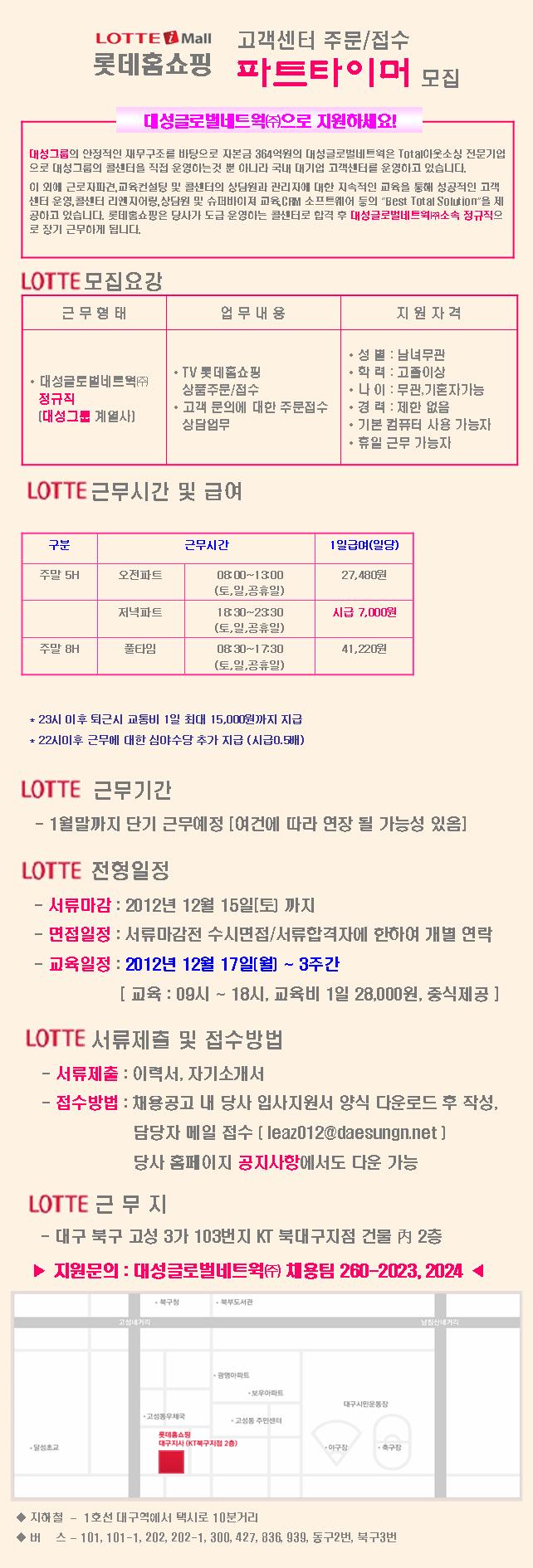 | 제목 | [주말파트타이머]TV 롯데홈쇼핑 고객센터 주문,접수 상담원 모집 | ||||