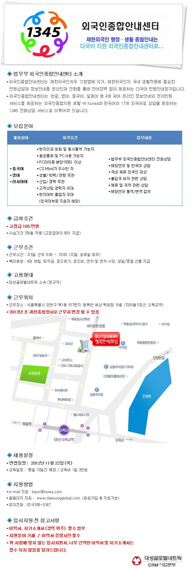 | 제목 | [양천/주5일] 외국인종합안내센터 상담원 모집 (영어/중국어/러시아어) | ||||