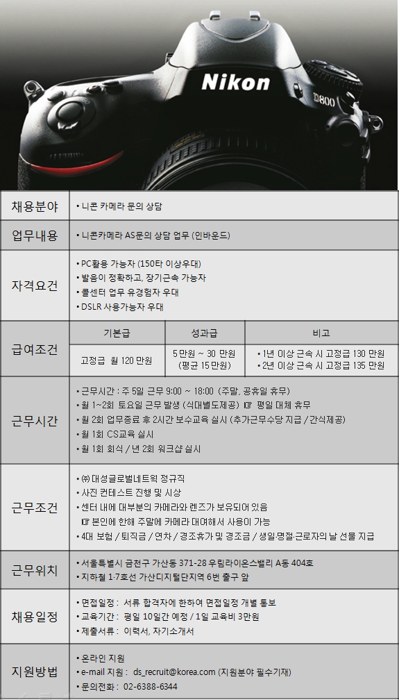 | 제목 | 니콘카메라 AS문의 인바운드 상담원 모집 | ||||