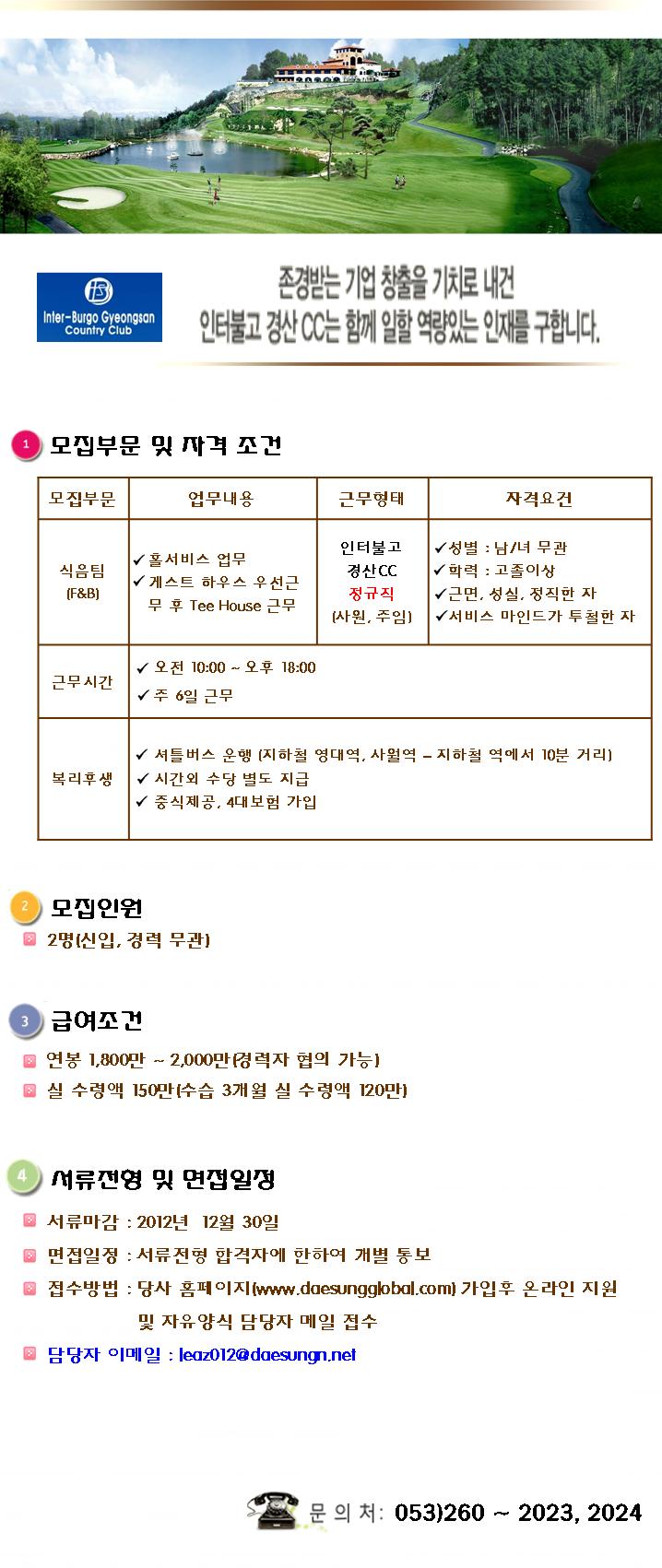 | 제목 | 인터불고 경산CC 웨이트리스 사원 모집 | ||||