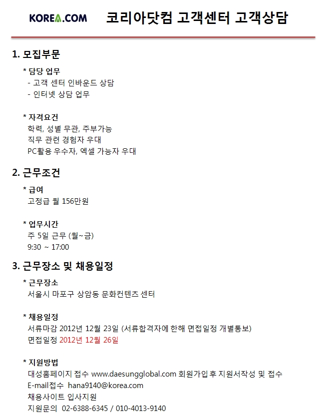 | 모집분야 | 코리아닷컴 고객센터 | 업직종 | 고객상담 | 마감일 | 2012-12-23 |