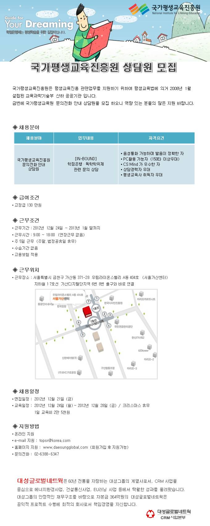 | 모집분야 | 평생교육진흥원 | 업직종 | 고객상담 | 마감일 | 2012-12-31 |