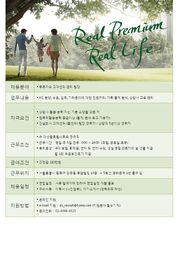 | 제목 | 대우 푸르지오 고객센터 관리 팀장 모집 | ||||