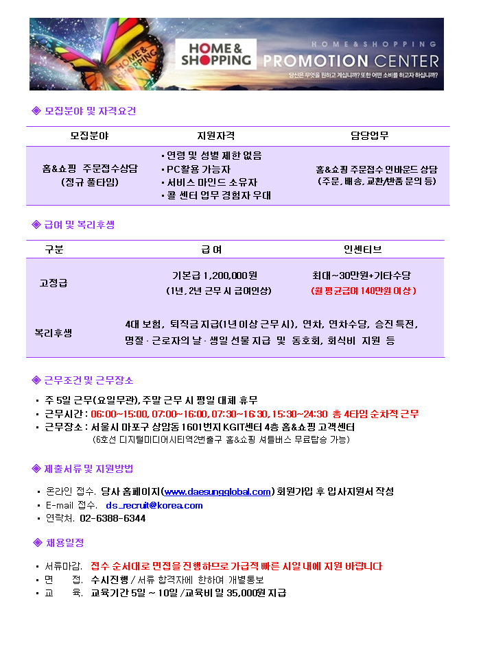 | 제목 | (마포)홈&쇼핑 주문접수 인바운드 정규상담원 모집 | ||||
