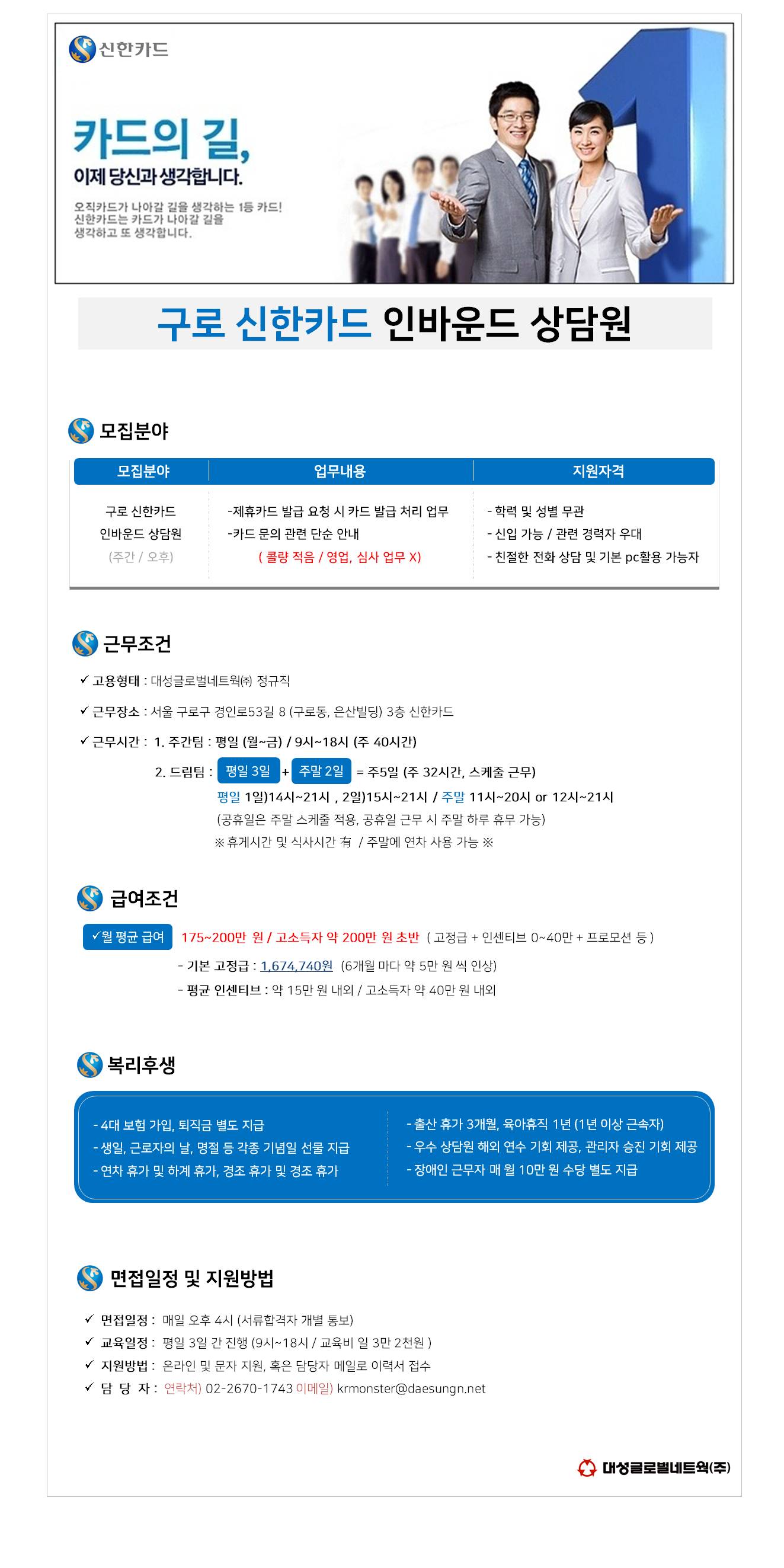 | 제목 | 구로역 신한카드 선포인트관련 단순상담/주5일(드림/주간) | ||||