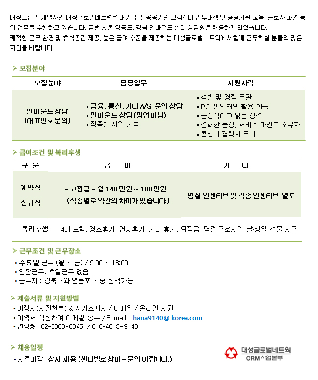 | 제목 | [대성글로벌] 서울 강북 / 영등포 / 강남 센터 인바운드 상담원 모집 | ||||