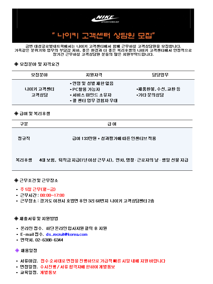 | 제목 | 나이키 고객센터 상담원 채용 | ||||