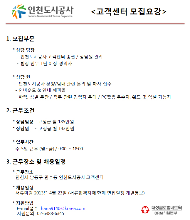 | 제목 | 인천도시공사 상담팀장/상담원 채용 | ||||