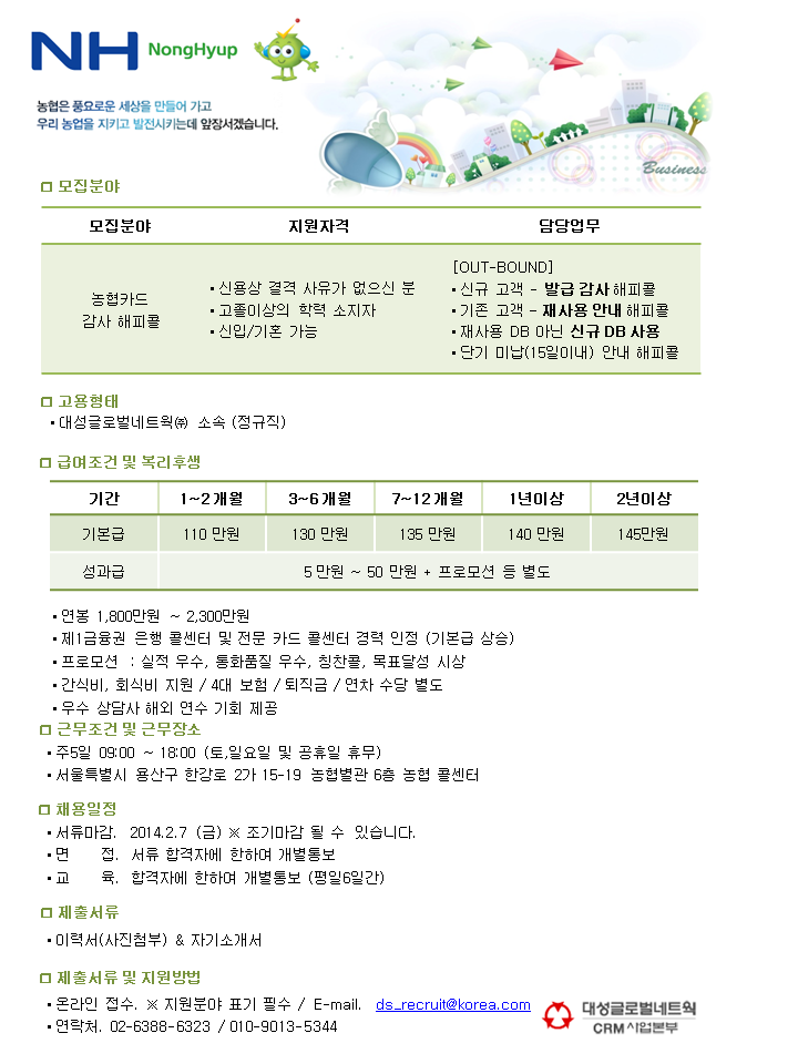 | 모집분야 | 농협 | 업직종 | 해피콜 | 마감일 | 2014-03-21 |