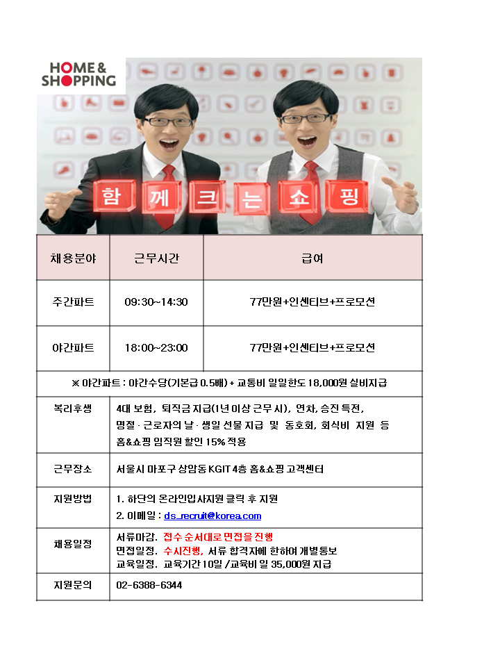 | 제목 | (주/야간파트) 홈&쇼핑 고객상담원 모집 | ||||