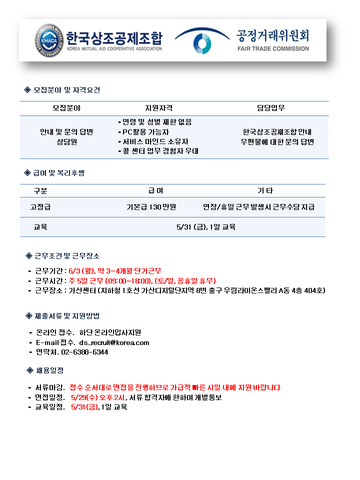 | 제목 | [주5일/3개월단기]한국상조공제조합 안내상담원 모집 | ||||