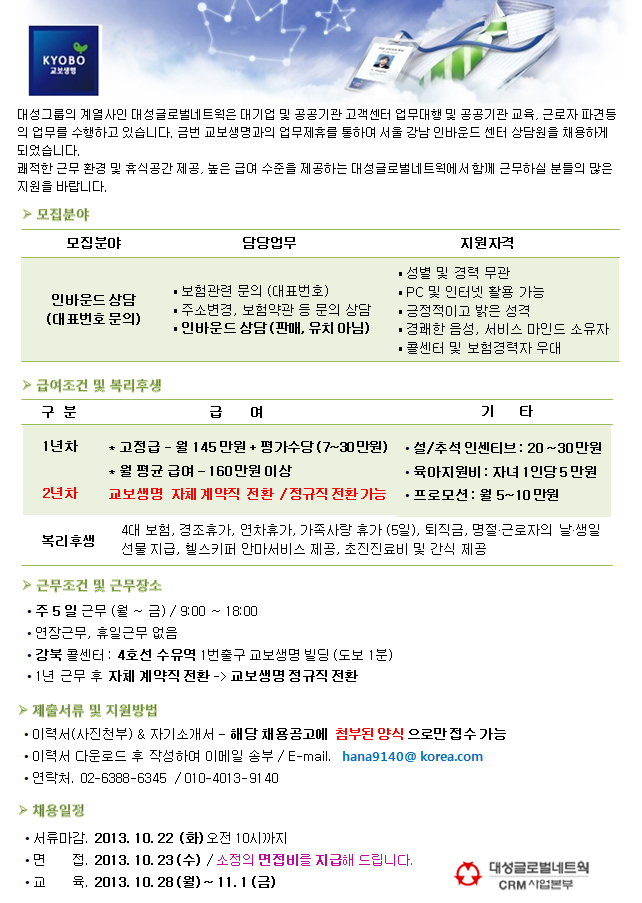 | 모집분야 | 교보생명 | 업직종 | 고객상담 | 마감일 | 2013-10-22 |