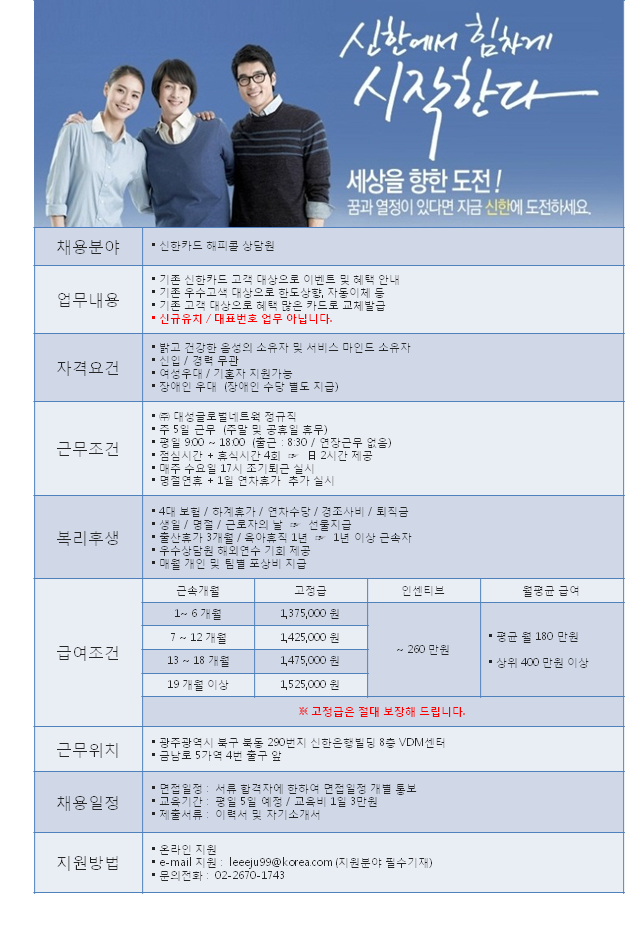 | 제목 | 광주 신한카드 단순해피콜 고객상담원 모집 | ||||