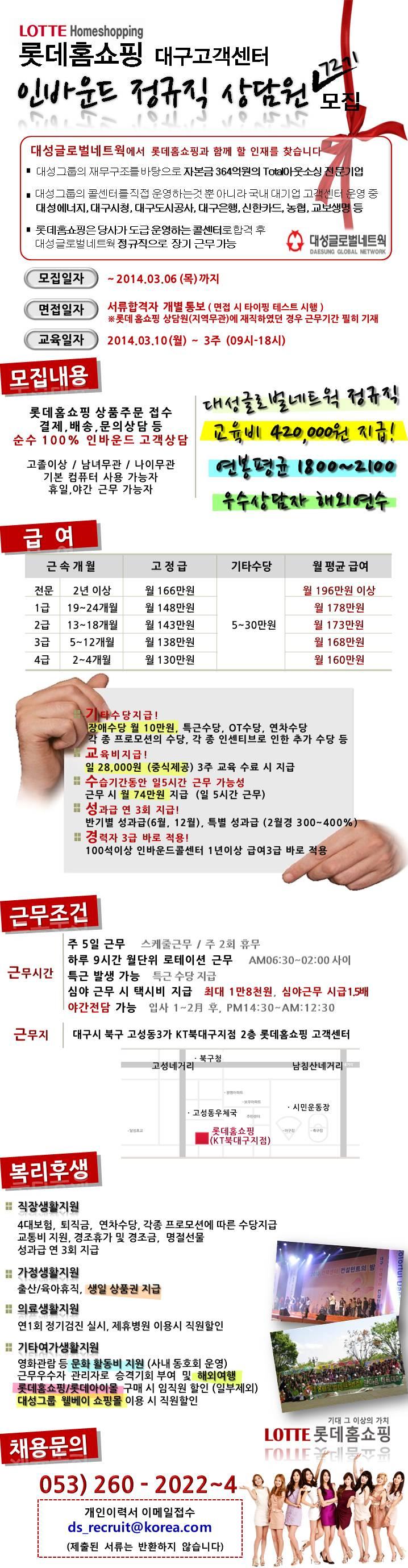 | 제목 | TV롯데홈쇼핑[lotteimall]고객센터 인바운드 상담원 모집 | ||||