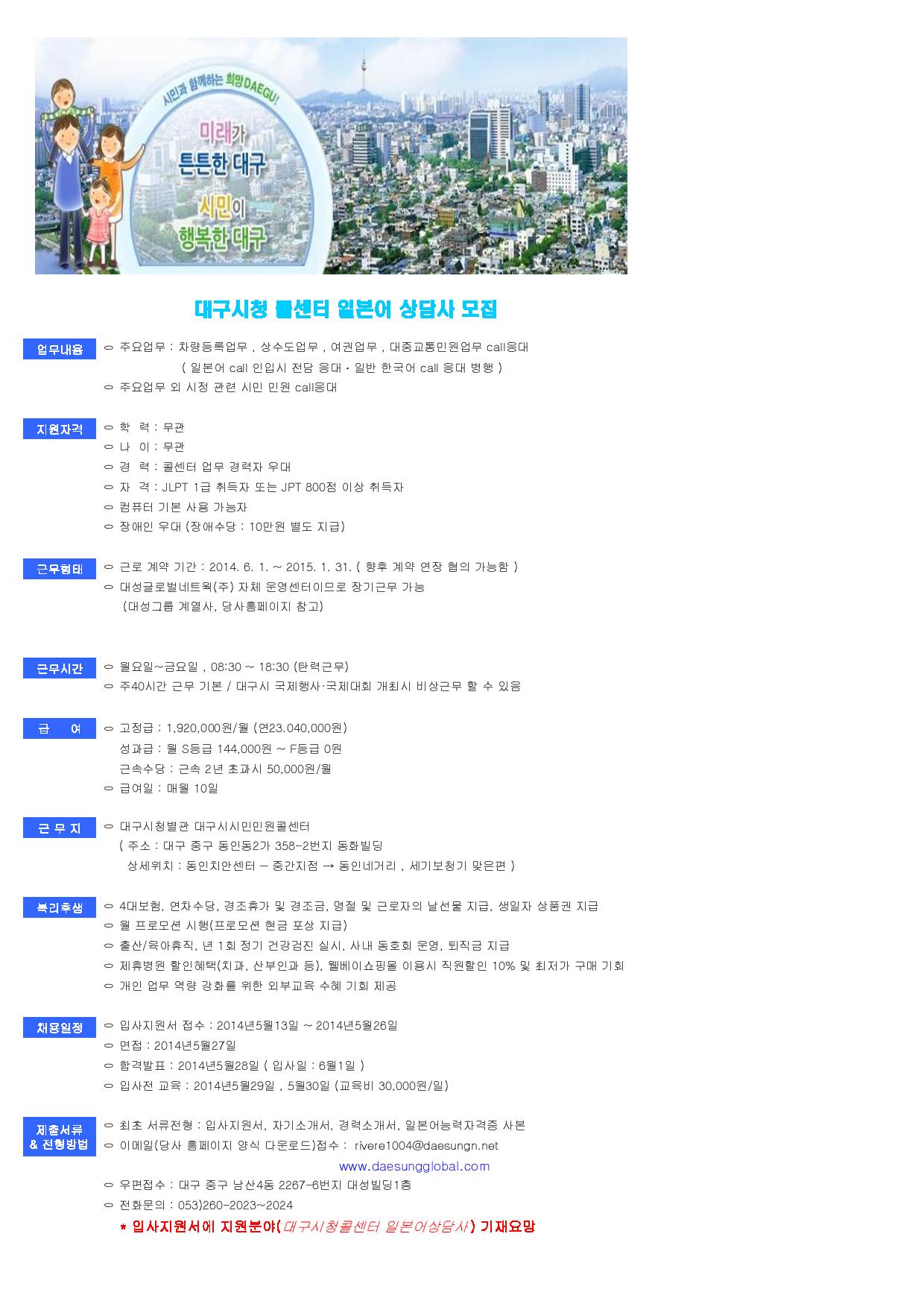 | 제목 | 대구시청 콜센터 일본어 상담사 모집 | ||||