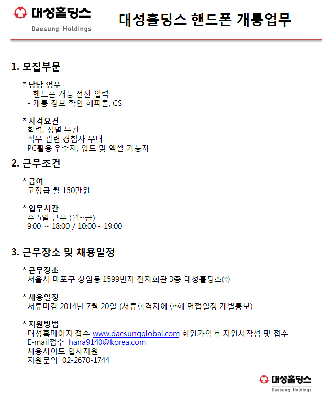 | 제목 | ▣(주5일/상암) 대성홀딩스 핸드폰 개통업무 사무지원 | ||||