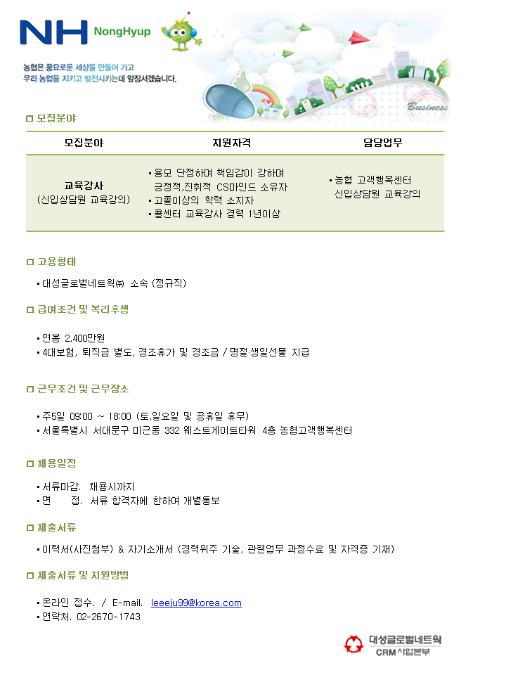 | 제목 | [정규직/주5일] 농협고객행복센터 교육강사 채용 | ||||