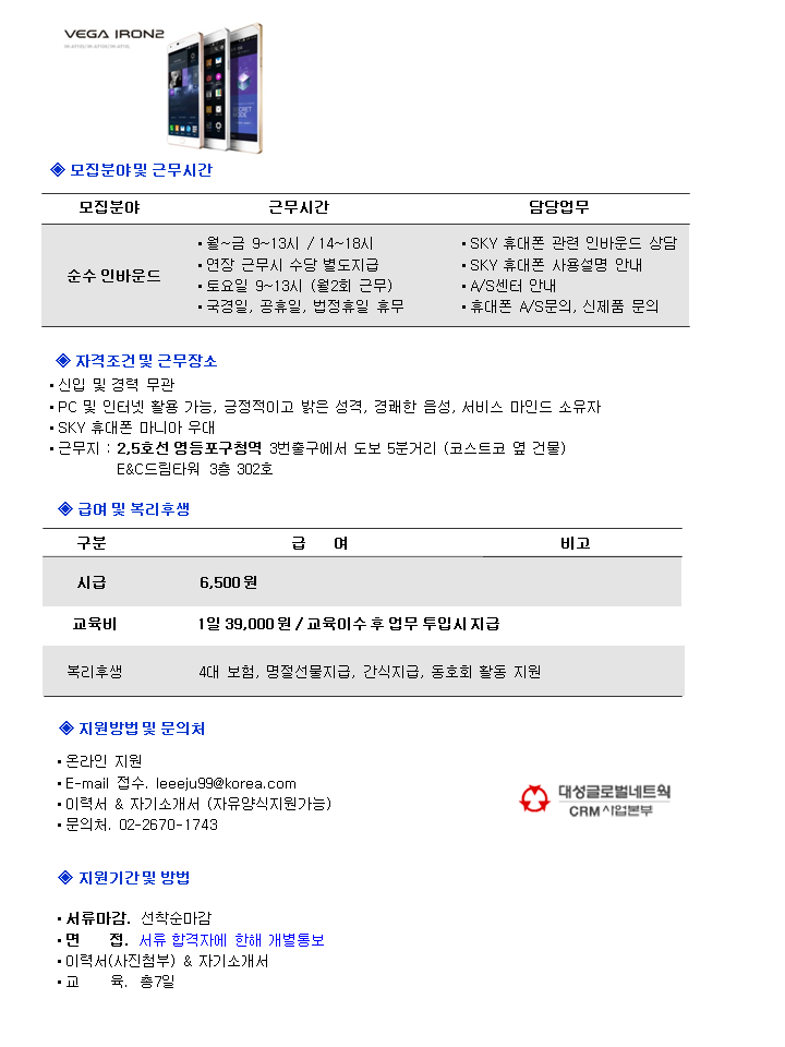 | 제목 | [4시간/파트] SKY 휴대폰관련 순수 인바운드 | ||||
