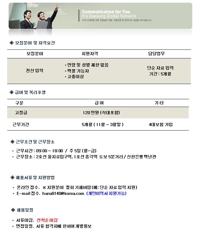 | 제목 | [단기] 을지로입구 단순 자료 입력 추가 모집 / 주5일 | ||||