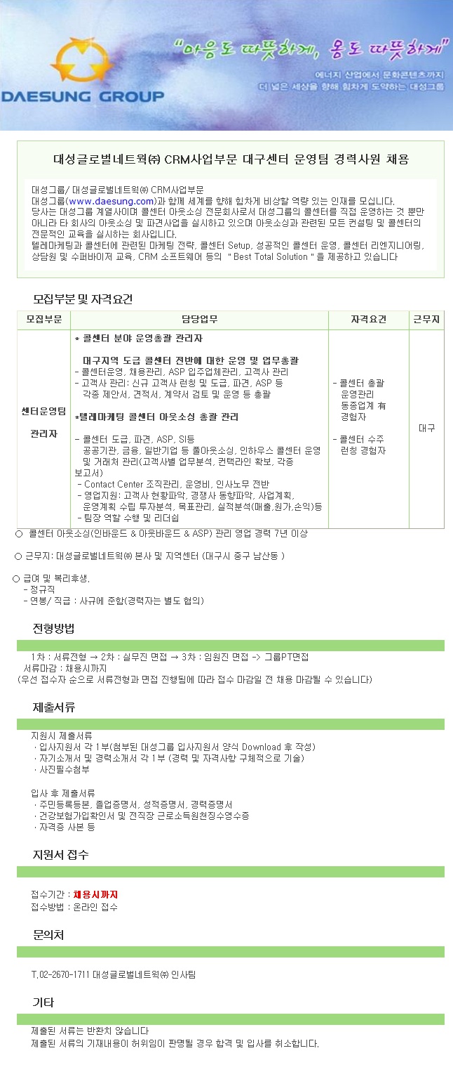 대성글로벌네트웍과 성공신화를 함께 할 진실한 인재를 찾고 있습니다. 진취적인 열정, 보다 넓고 깊은 꿈을 가지신