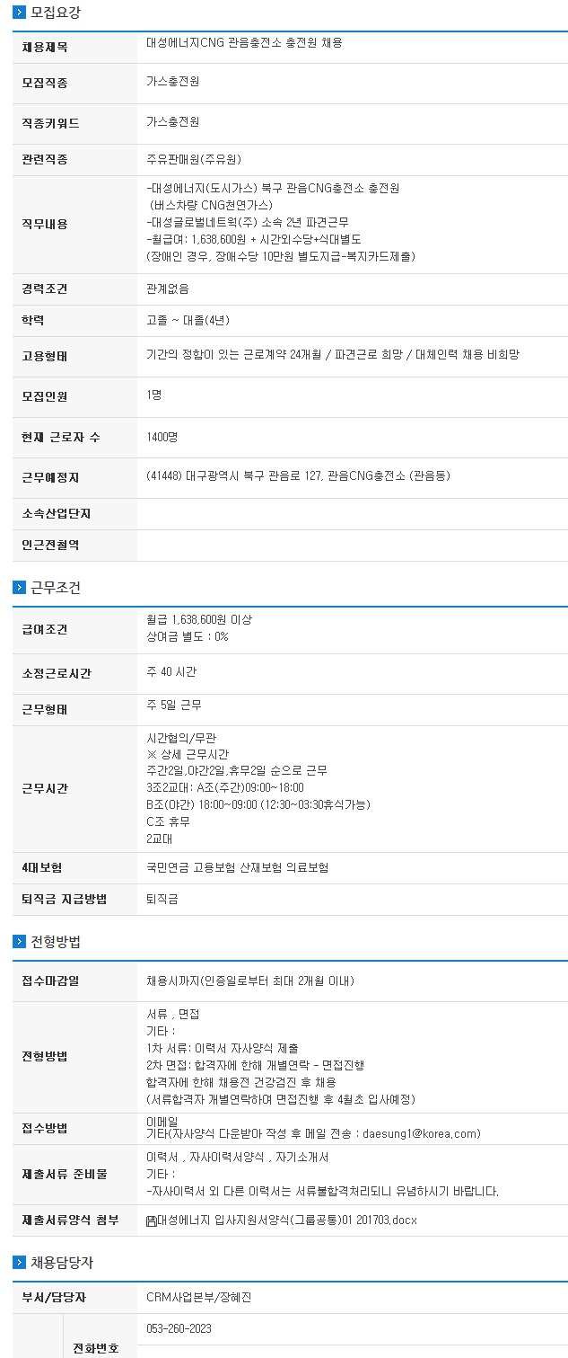 | 제목 | 대성에너지 관음CNG충전소 충전원 모집 | ||||