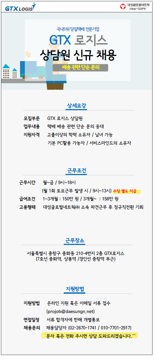 | 제목 | GTX로지스택배 상담원 모집 | ||||